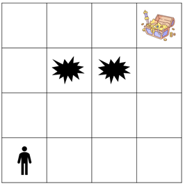 맨 왼쪽 아래 칸의 좌표를 (1, 1)으로, 맨 오른쪽 위 칸의 좌표를 (n, m)으로 나타냈을 때, 보물은 (n, m) 좌표에 묻혀있습니다. 또한, 일부 칸에는 함정이 있으며, 해당 칸으로는 지나갈 수 없습니다.