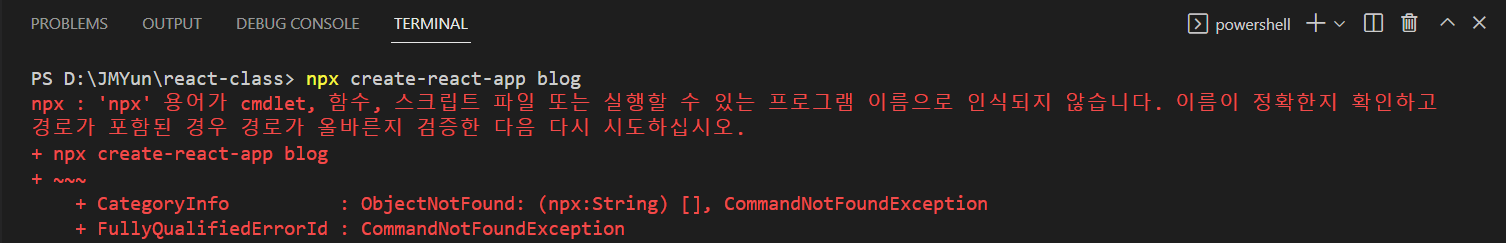vscode를 이용하여 react 프로젝트를 해보려고 하는데 nodejs 설치 후 아래와 같이 ObjectNotFound 오류가 발생했음