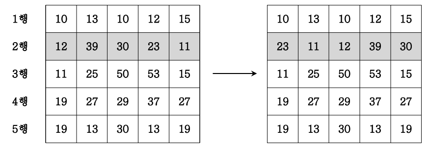 만약 회전명령 정보가 2 0 3이면 2번째 행을 왼쪽으로 3만큼 아래 그림처럼 회전시키는 명령입니다.