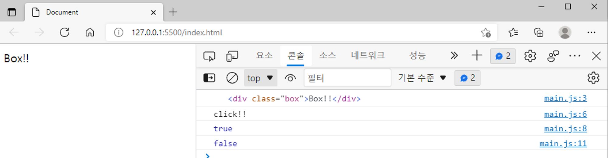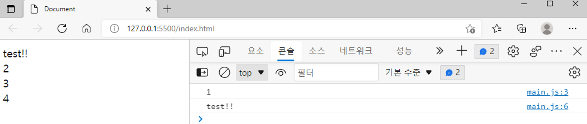 index.html 파일은 그대로, main.js 파일만 하기와 같이 수정 한 뒤 소스 코드 실행