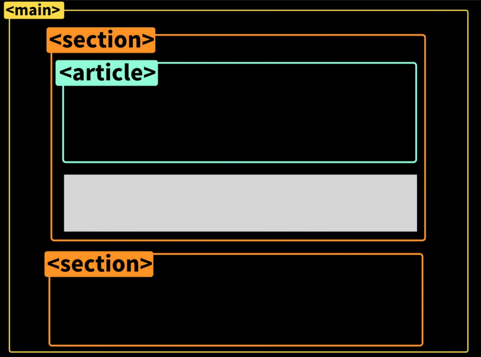 - <article>: 블로그에서 포스트 1개, 신문기사에서 기사 1개 자체를 묶을때. 자체만으로 독립적으로 다른 페이지에 보여줬을 때 전혀 문제 없을 때 사용. =⇒ 메인 안에 있는 다른 내용들과 전혀 상관 없이, 독립적으로 고유한 정보를 나타낼 때 사용