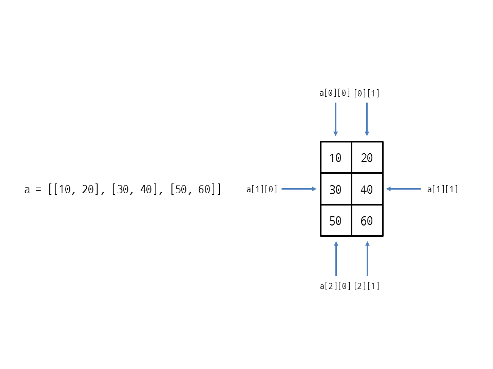 Unit 23. 2차원 리스트 사용하기 리스트를 사용할 때 한 줄로 늘어선 1차원 리스트를 사용했는데 이번에는 평면 구조의 2차원 리스트를 사용해보겠습니다. 2차원 리스트는 다음과 같이 가로×세로