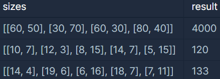 가장 긴 가로 길이와 세로 길이가 각각 80, 70이기 때문에 80(가로) x 70(세로) 크기의 지갑을 만들면 모든 명함들을 수납할 수 있습니다. 하지만 2번 명함을 가로로 눕혀 수납한다면 80(가로) x 50(세로) 크기의 지갑으로 모든 명함들을 수납할 수 있습니다. 이때의 지갑 크기는 4000(=80 x 50)입니다.